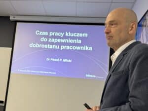 Pawel P. Mlicki, Ph.D., Senior Consultant and Mediator w Déhora Consultancy, przedstawił prezentację pt. „Czas pracy kluczem do zapewnienia dobrostanu pracownika”.